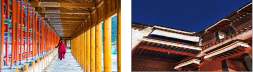 拉卜楞寺院的建筑粗獷大方,古樸典雅,穩(wěn)堅耐用。大型佛殿頂部,均有銅質(zhì)鎏金法輪、陰陽獸、寶瓶、勝幢、雄獅等。整個建筑莊嚴(yán)巍峨、宏偉壯