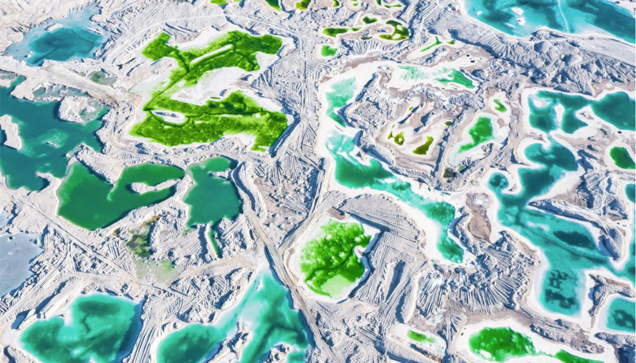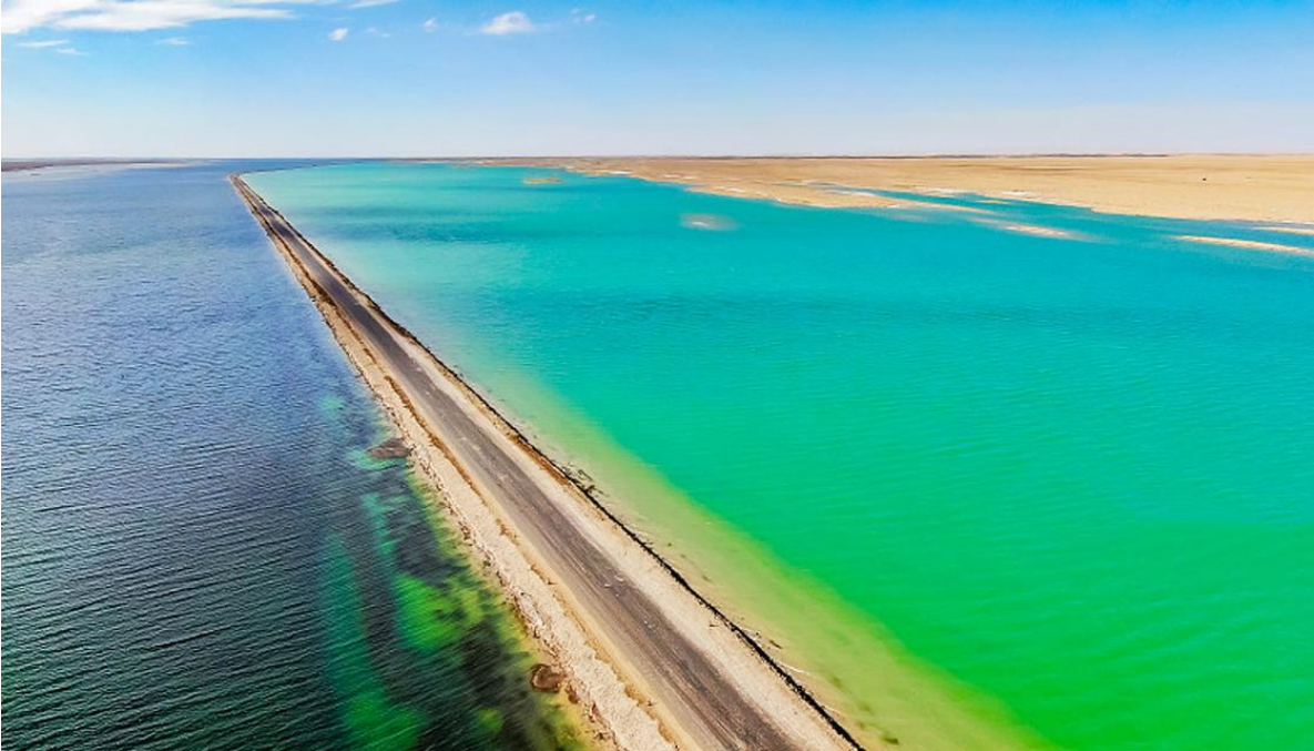 西臺(tái)吉乃爾湖是固液相并存的鹽湖,為第四系洪積、沖積、風(fēng)積、湖相碎屑沉積和鹽類化學(xué)沉積。一條公路把湖水分開(kāi),一邊綠色,一邊藍(lán)色涇渭分