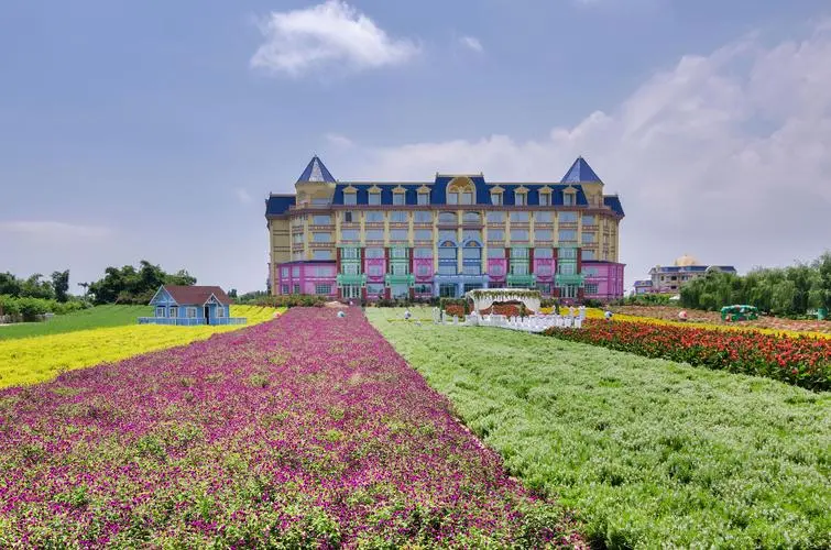 三座粉、藍(lán)相間的巨型迪斯尼風(fēng)格門樓,一片橙色的仙女花在陽光恬靜地流敞著。七個巨型的氣球“串”綻放繽紛色彩,邊上還圍著精美的花柱。香格里拉,正如其名,有著一種永恒、和平、寧靜的 “世外桃源”。